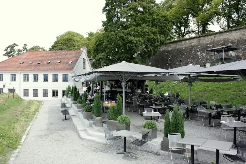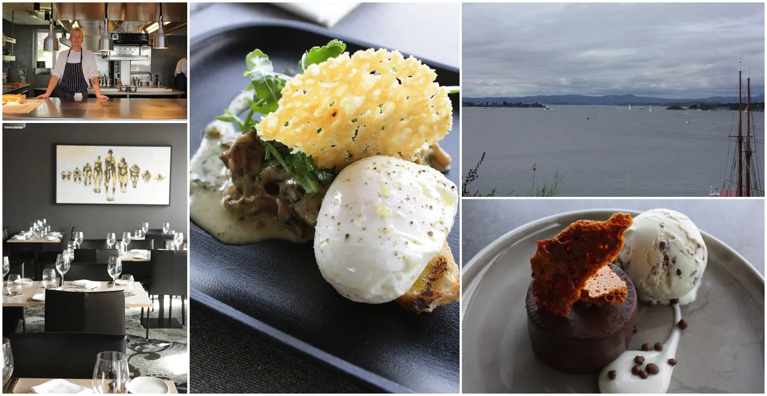 Via de Opera House en een wandeling langs de zee en door een deftig deel van Oslo kwamen bij de Akershus Festning uit. We waren benieuwd of we hier een restaurant gingen vinden. We liepen omhoog, om de heuvel heen en onze mond viel letterlijk open. In de verte doemde Restaurant Festningen op met werkelijk waar het mooiste uitzicht van heel Oslo. Het restaurant is aan de prijs, maar sinds kort hebben ze buiten ook een prachtig en laagdrempelig terras waar je zeer goed kunt eten. Wij bestelden het dagmenu met paddenstoelen op toast met een gepocheerd ei gevolgd door een stuk kabeljauw met schelpdieren, risoni, spinazie en tomaat. Met een valrhona dessert toe. De gehele lunch bleven we maar kijken naar de fjorden, de haven en al het prachtigs wat er te zien was.