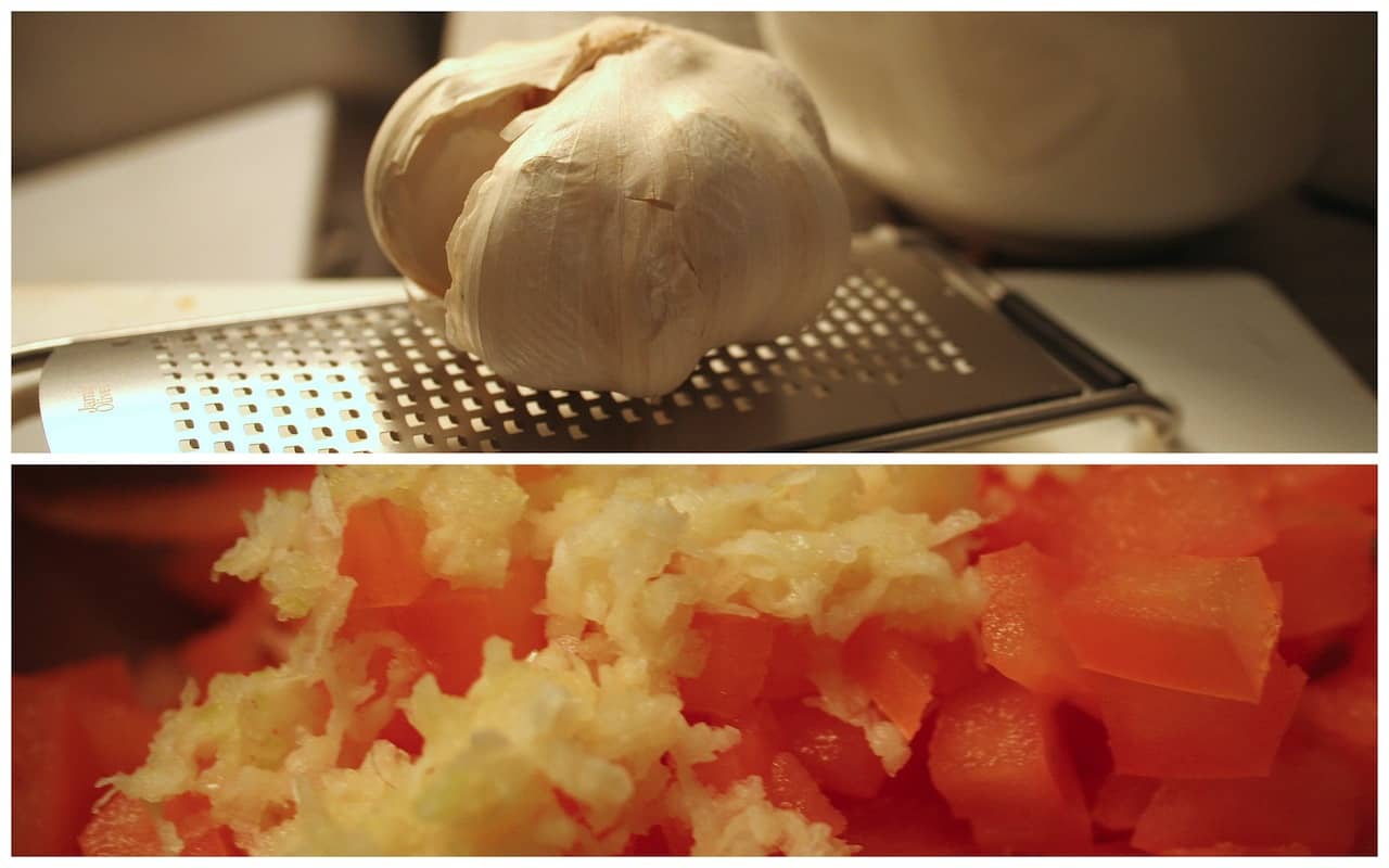 Ik besloot er knoflook mee te raspen voor mijn bruschetta’s. Want in het tomatenmengsel gaan veel, heel veel, teentjes knoflook en om dit zo fijn mogelijk te snijden kost me a) te veel tijd en b) het is toch nooit fijn genoeg.
