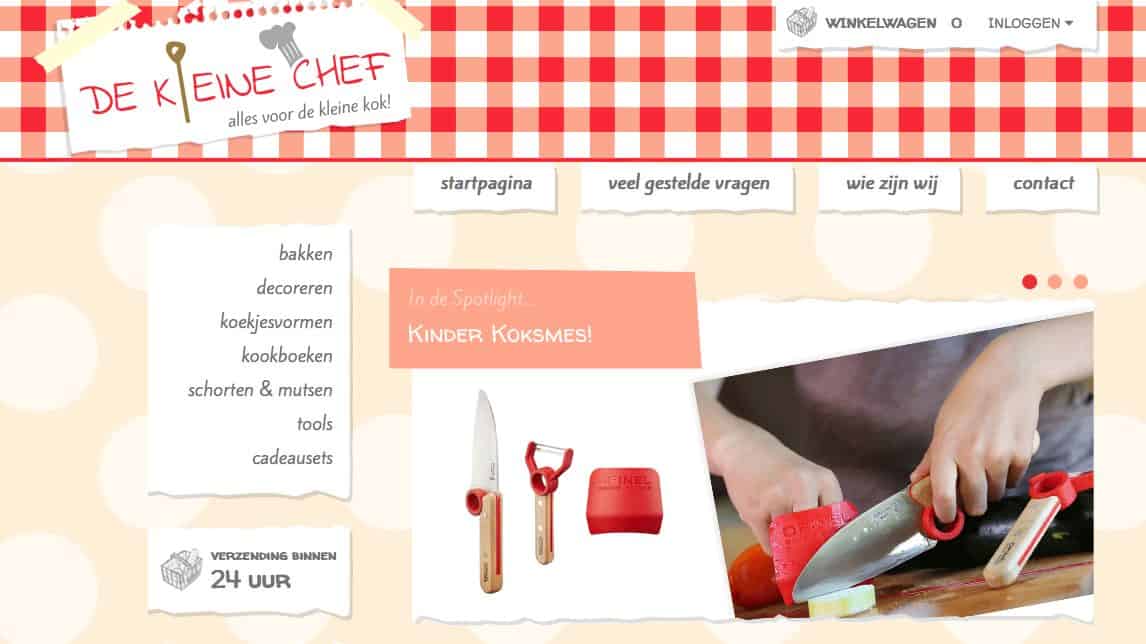 In de jaren dat ik nu kook met kinderen ben ik steeds op zoek geweest naar een winkel of webshop waar ze kinderkookgerei verkopen. En dat was niet altijd makkelijk. Want vaak worden er wel een paar dingetjes verkocht, maar is het assortiment niet erg uitgebreid. Tot een paar weken geleden toen ik benaderd werd door De Kleine Chef, een nieuwe webshop die volledig is gespecialiseerd in alles om te koken met kinderen. Mijn nieuwsgierigheid was groot en ik ging gelijk eens kijken in hun shop. Geweldig! Eindelijk een online winkel waar ik alles kan vinden; veilige messen, kookschorten, bakvormpjes en een uitgebreide collectie aan kinderkookboeken.