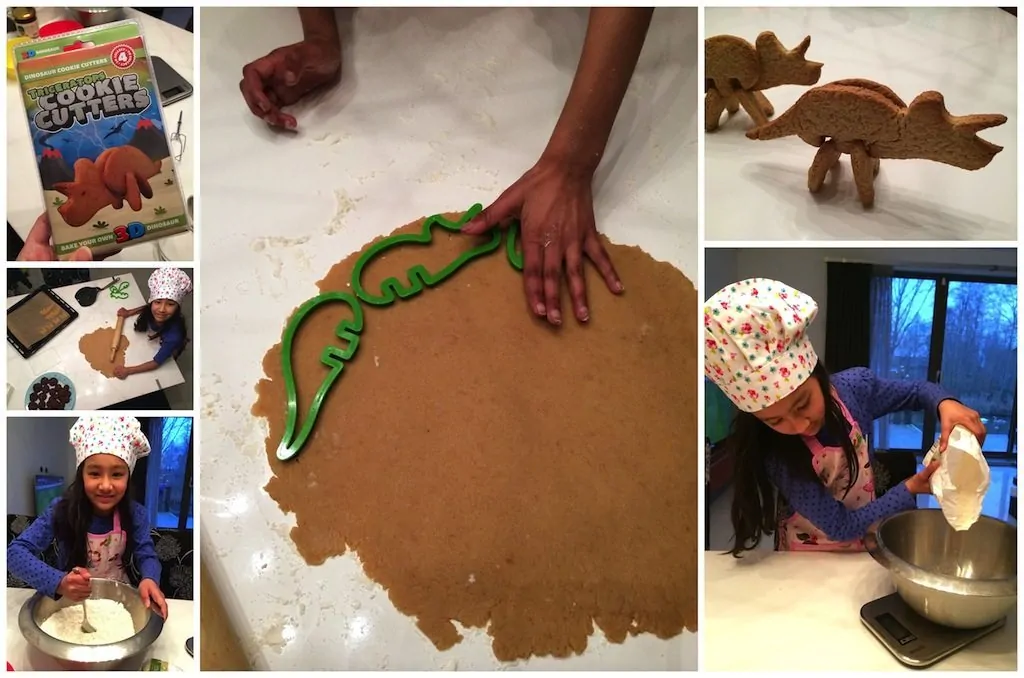 Eerst maakten we samen het koekjesdeeg. Met een makkelijk recept zodat ze zelf kon roeren en kneden. Het deeg uitrollen deed ze ook helemaal zelfstandig, met opperste concentratie. En toen was het tijd voor het uitsteken. Voor de 3D koekjes steek je verschillende onderdelen uit. Twee verschillende vormpjes voor het lijf en een vormpje voor de poten. Iedere dinosaurus bestaat uit 4 verschillende koekjes die je eerst 10 minuten in de oven bakt en daarna in elkaar steekt. Erg leuk om te doen met kinderen! Kleine tip: omdat de koekjes iets uitlopen tijdens het bakken, gebeurt het soms dat de koekjes van het lijf net niet helemaal passen in de pootjes. Pak dan een scherp mesje en snijdt een dun reepje koek weg. Daarna past het perfect. Ik ben fan van de 3D koekjes, die gaan we vast nog vaker gebruiken met feestjes en partijen. Een set met de bakvormen kost € 9,95.