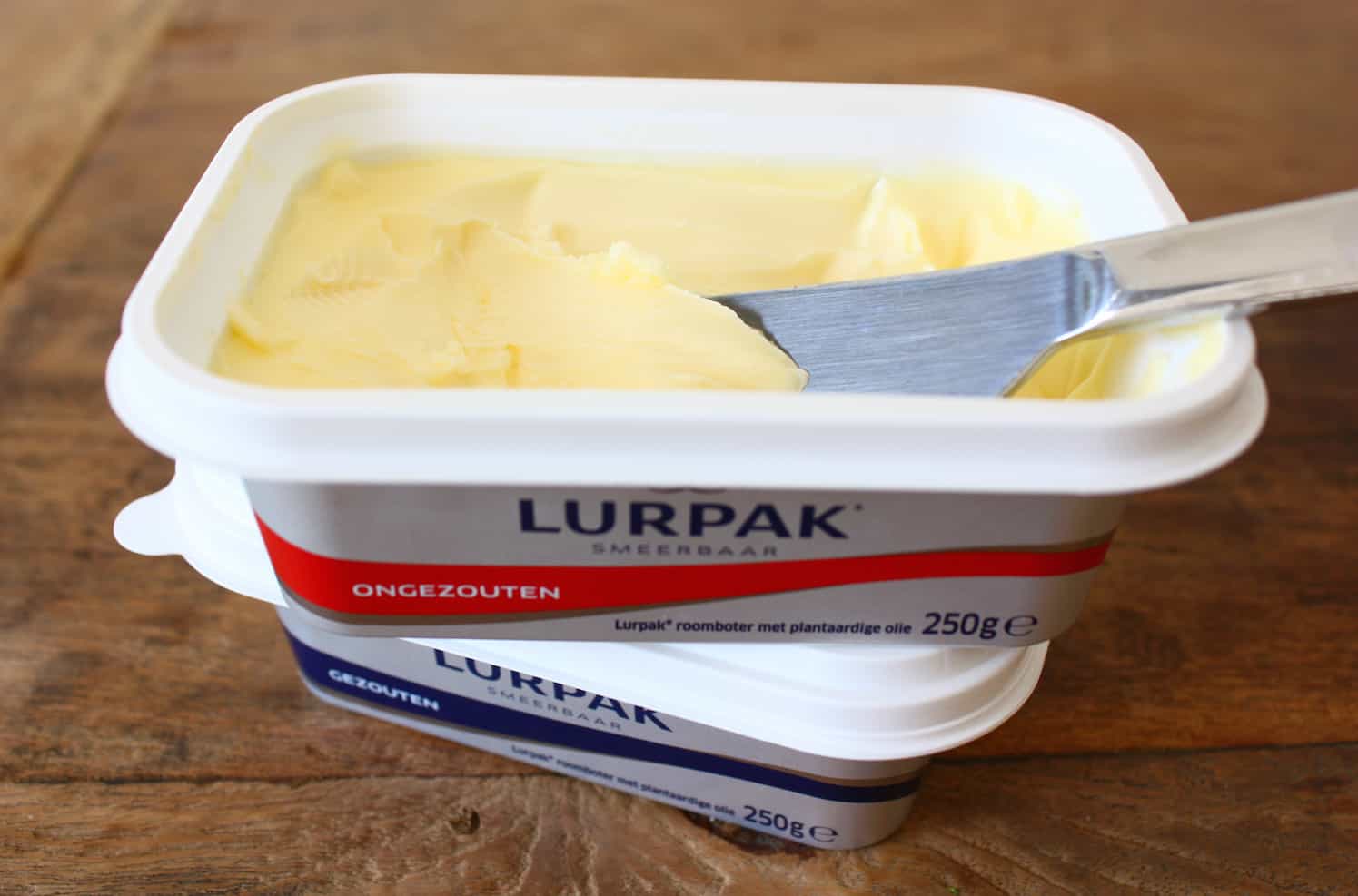 Voor het geval je Lurpak (nog) niet kent: deze Deense boter in de wikkel, die al meer dan 100 jaar op traditionele wijze wordt geproduceerd, vind je ook in het koelschap van de supermarkt. Daarnaast hebben ze ook Lurpak Smeerbaar, in de rode en blauwe kuipjes, met of zonder zout en makkelijk smeerbaar. Ook als je het kuipje uit je koelkast haalt.