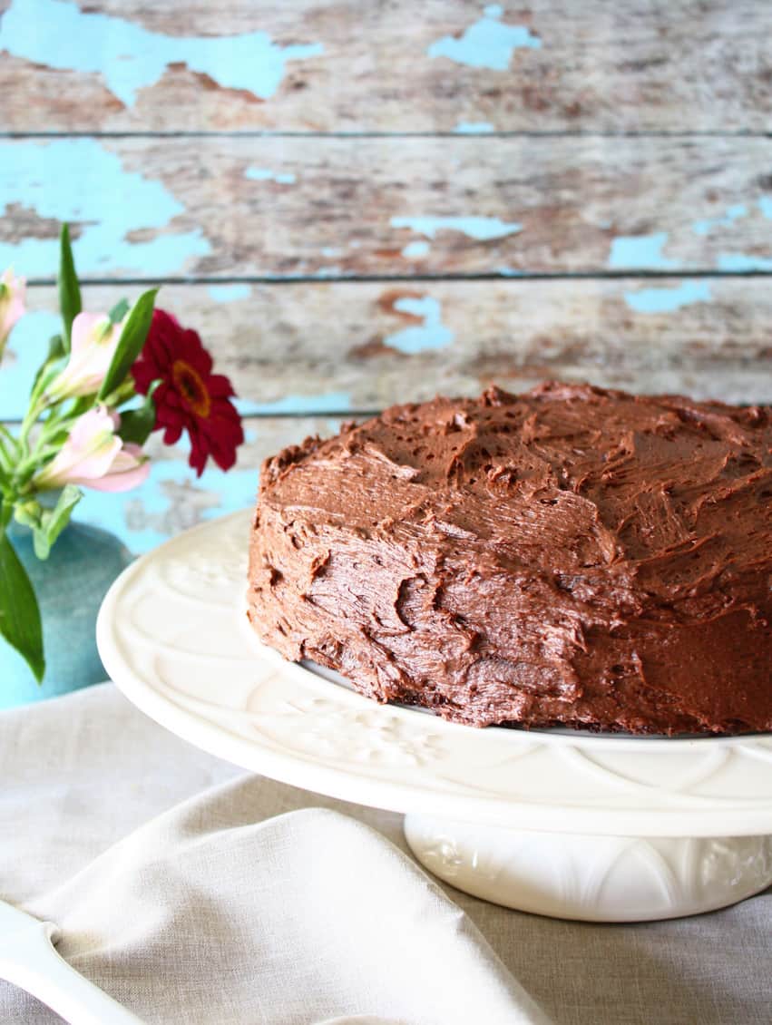Met het verstrijken van de jaren merk ik wel dat het steeds makkelijker gaat. Bij het bakken van een cake hoef ik geen recepten van anderen meer te raadplegen. En koekjes zijn ook zo gemaakt. Toen mijn kleuter me afgelopen weekend de opdracht gaf om een chocoladetaart te bakken voor oma’s verjaardag, moest ik echter wel even op zoek. Mijn inspiratie voor de taart haalde ik bij Foodess en het idee voor de frosting kwam bij Add a Pinch vandaan. Uiteindelijk heb ik beide recepten volledig aangepast totdat ik bij de dubbele chocoladetaart met sinaasappel uitkwam waar ik zelf helemaal gelukkig van werd. Een smeuïge cake met daartussen een laag sinaasappel confiture en vervolgens ingesmeerd met de allerlekkerste chocolade frosting.