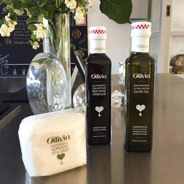 Nog een leuk detail. Voor deze taart heb ik een hele bijzondere olijfolie uit Kroatië gebruikt. Van Oilivia, het merk van twee zusjes met Kroatische roots wat ze in Nederland verkopen. Hun familie houdt al generaties lang olijfbomen en daar maken zij geweldige olijfolie extra vergine van. Hun achternaam is zelfs Ulje en dat betekent olijfolie in het Kroatisch. De olijfolie is heel fris en puur, maar heeft ook een krachtig pepertje in de nasmaak. Ik vond ‘m zalig en besloot dat deze uitverkoren was om in het beslag te gaan. De olijfolie werkt trouwens ook heel goed in salades of over de pasta. Wil je eens een andere olijfolie uitproberen, check dan de site van de dames van Oilivia. Je kunt ook direct bij ze bestellen in de webshop.