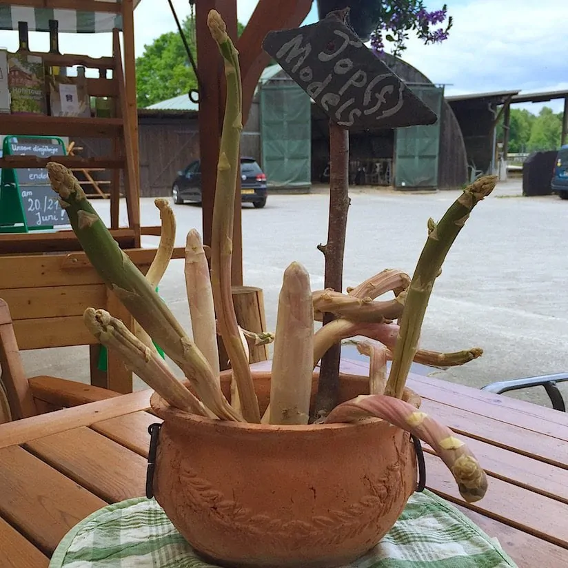 Op het grote erf heerst rust en ik word zeer vriendelijk ontvangen door vader en dochter. We nemen plaats op een bankje en onder het genot van een koffie kijk ik naar het stilleven wat voor mij staat. Bij dit aspergebedrijf worden alleen de beste asperges verkocht, maar de buitenbeentjes krijgen ook een plaats. Op tafel als ‘topf models’, zodat iedereen ze kan bewonderen.