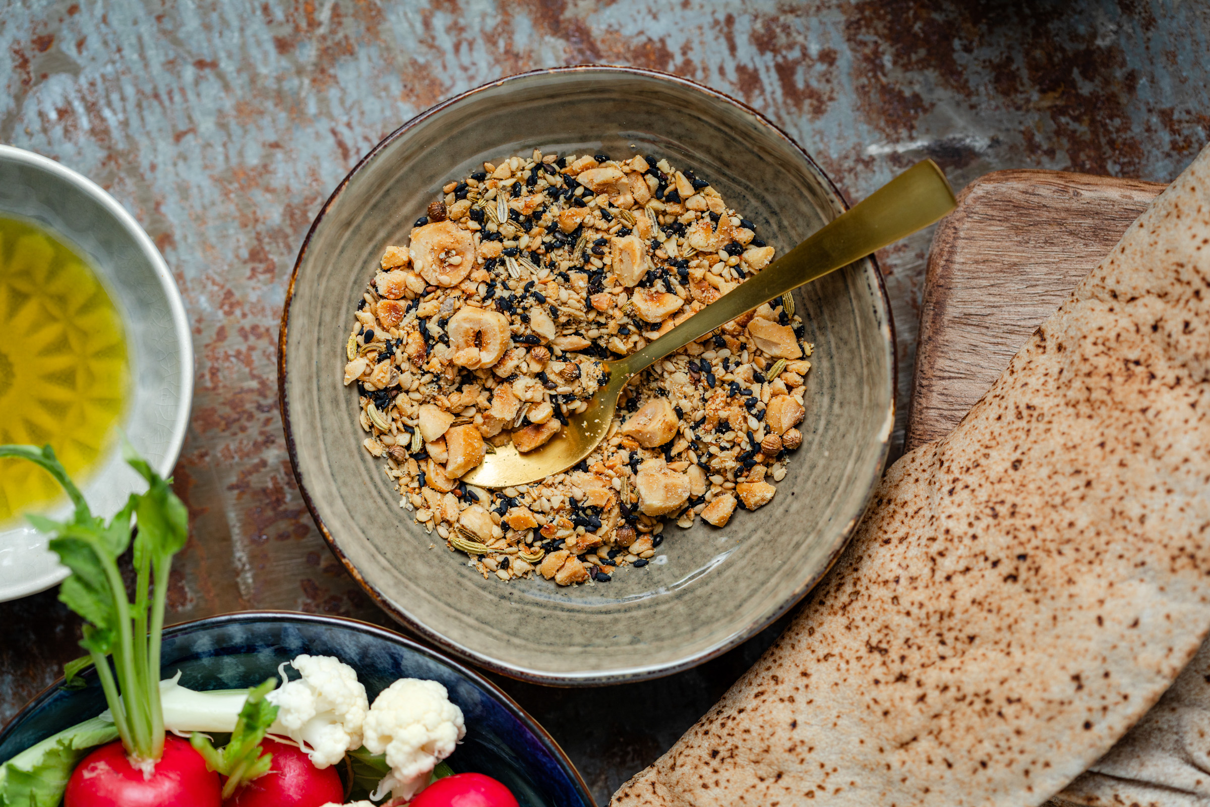 Heb je weleens dukkah geproefd? Deze Midden-Oosterse specerijenmix zit boordevol smaak en is verrassend veelzijdig in de keuken. Oorspronkelijk komt dukkah uit Egypte en wordt het traditioneel gegeten als dip met brood en olijfolie. Je doopt een stuk flatbread eerst in olijfolie en daarna in de dukkah. Simpel, maar zó smaakvol.
