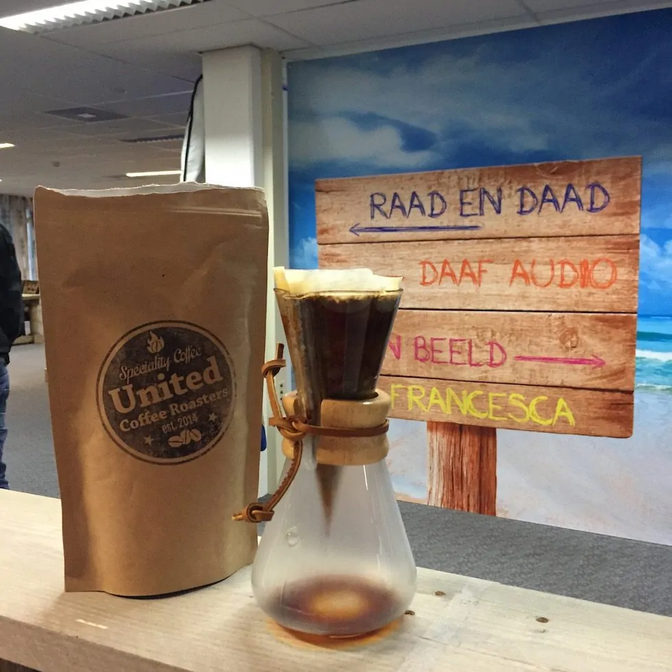 Slow brewed koffie uit de chemex op kantoor, mijn dag kan niet beter beginnen. Die chemex starter kit en een aantal zakken met topkwaliteit bonen heb ik cadeau gekregen van United Coffee Roasters.