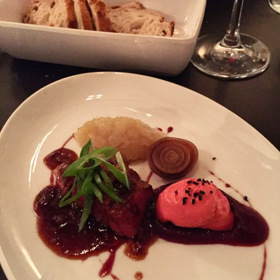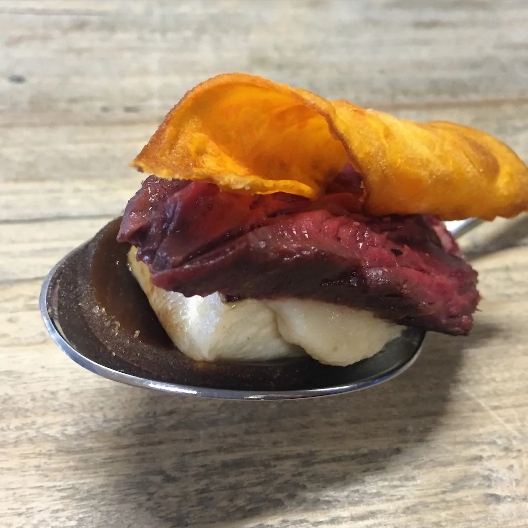 Na een paar fantastische oesters schuif ik aan de lunchtafel om de kleine 1-hapsgerechtjes te proeven. Dit hapje met jus de veau, gegrilde knolselderij, knolselderijpuree met szechuan peper, onglet en zoet aardappelchipje was echt hemels! De rest trouwens ook.
