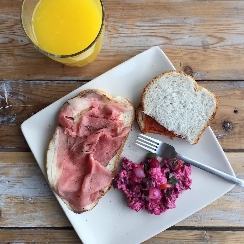 Ik ben weer helemaal het dametje vandaag en kan wederom uitslapen, want de peuter is nog bij oma. De kostbare tijd gebruik ik om wat blogs vooruit te schrijven terwijl ik mijn ontbijt van 2 gekookte eieren met avocado en worst eet. Als lunch eet ik allemaal heerlijkheden van de Valk Versmarkt. Desembrood met filet americain, gerookte entrecote en een rode bietensalade.