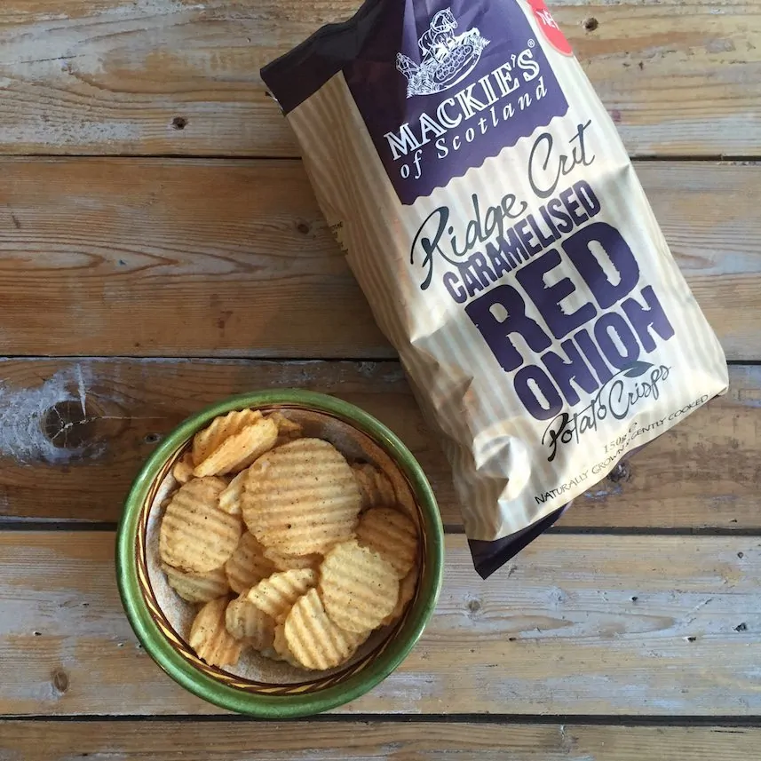 In de middag eet ik nog wat stukjes paprika en een bakje ‘caramelised red onion’ ribbelchips van Mackie’s of Scotland. Die zijn nice.