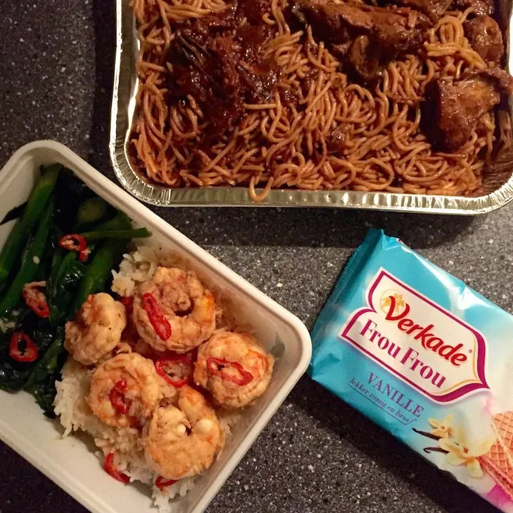 Nou wilde ik koken, maar The Mr. haalt ons ventje op en appt dat oma eten klaar heeft staan. Wie ben ik dan om achter het fornuis te kruipen, niet waar? Hij komt thuis met bami met kip, rijst met garnalen en een pakje Verkade Frou Frou. Dat eten we samen op, precies in die volgorde.