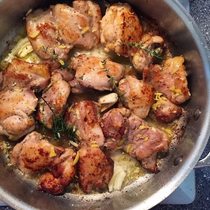 Ik begin de week met een bakje havermout met peer en appel en natuurlijk een cappuccino. Het is een helse dag thuis met kind en werk. Niet dat mijn kind hels is (verre van), maar af en toe vind ik het echt een flinke opgave om werk, kind en huishouden op een dag te combineren. Werken als zelfstandige stopt namelijk nooit dus dat probeer ik dan zo goed mogelijk in te plannen op een dag. Ik heb gelukkig nog een broodje geitenkaas met geroosterde paprika en shiitake bewaard van de vorige dag (aluminiumfolie doet wonderen) en die verwarm ik in de oven. Datzelfde broodje, maar dan met gesmolten geitenkaas is echt top! ‘s Middags kook ik alvast voor ‘s avonds en besluit butter lemon chicken te maken. Op een paleo-vriendelijke manier.