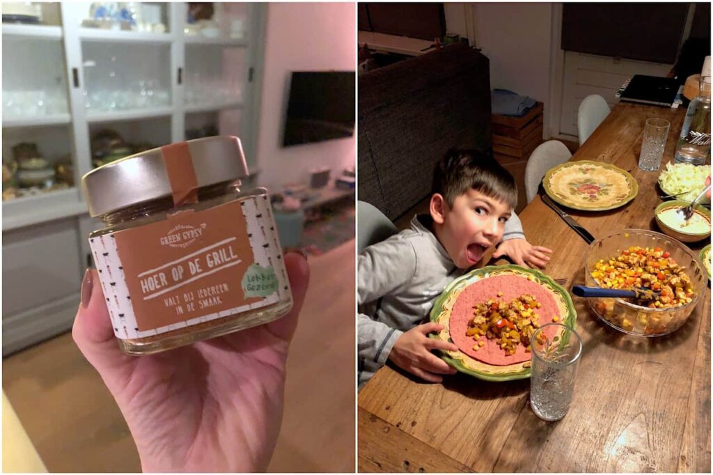 In de avond maak ik wraps met restjes en daarvoor gebruik ik de Hoer op de Grill van Green Gypsy Spices. De groentewraps van No Fairy Tales besmeer ik met sour cream en die worden vervolgens belegd met roergebakken kip met de Hoer, paprika en mais. Daarop nog wat ijsbergsla, avocado en belegen kaas. Heerlijk maaltje!
