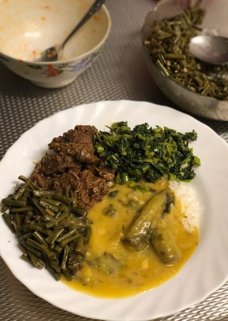 In de avond eten we bij schoonmama en die heeft zalig gekookt. Zacht gegaard rundvlees met dahl, kangkung, kousenband en witte rijst. Alleen het potje sambal was leeg toen ik aan de beurt was, heb ik weer. Baby Zayne eet dit trouwens ook allemaal (exclusief de sambal, maar goed die was toch al op) en dat vindt hij zalig. De aanleg voor Surinaams eten is toch echt genetisch bepaald.