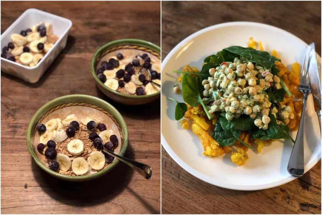 Nieuwe dag, nieuw ontbijt! Volgens het AH Kickstart-receptenboekje eten we vandaag Griekse yoghurt 0% met ontbijtgranen, banaan en blauwe bessen uit de diepvries. Vanwege het drama van afgelopen maandag geef ik Jessey maar gelijk granola in plaats van muesli. Dat gaat beter, maar nu vindt meneer de blauwe bessen weer niets. Zo blijf je bezig, haha.