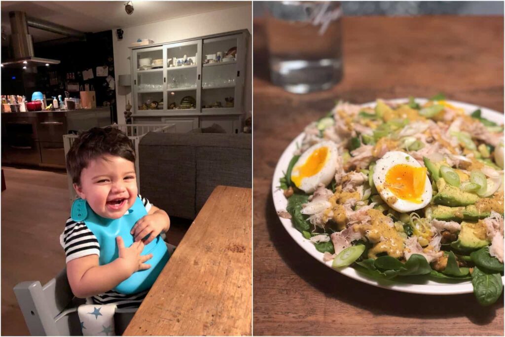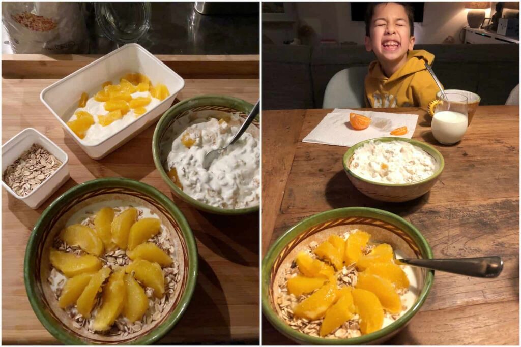 Ik begin de dag met een bakje yoghurt met muesli en sinaasappel. Dit is het eerste recept van de Kickstart 10-daagse die ik samen met Albert Heijn aan het volgen ben. In dit eetdagboek ga ik nog niet verklappen wat ik ervan vond (nou oké, een klein beetje dan), maar laat ik wel zien wat we allemaal gegeten hebben in de eerste 7 dagen. Mijn mannen doen trouwens ook mee, zelfs Jessey gaat ’s ochtends aan de muesli. Dat vond hij dus echt niet te eten en ik geef hem na de standaard 5 happen (eerst 5 happen proeven en daarna pas mopperen is de regel bij ons thuis) een bakje met yoghurt en een mandarijn. Het kind is daarna weer blij.