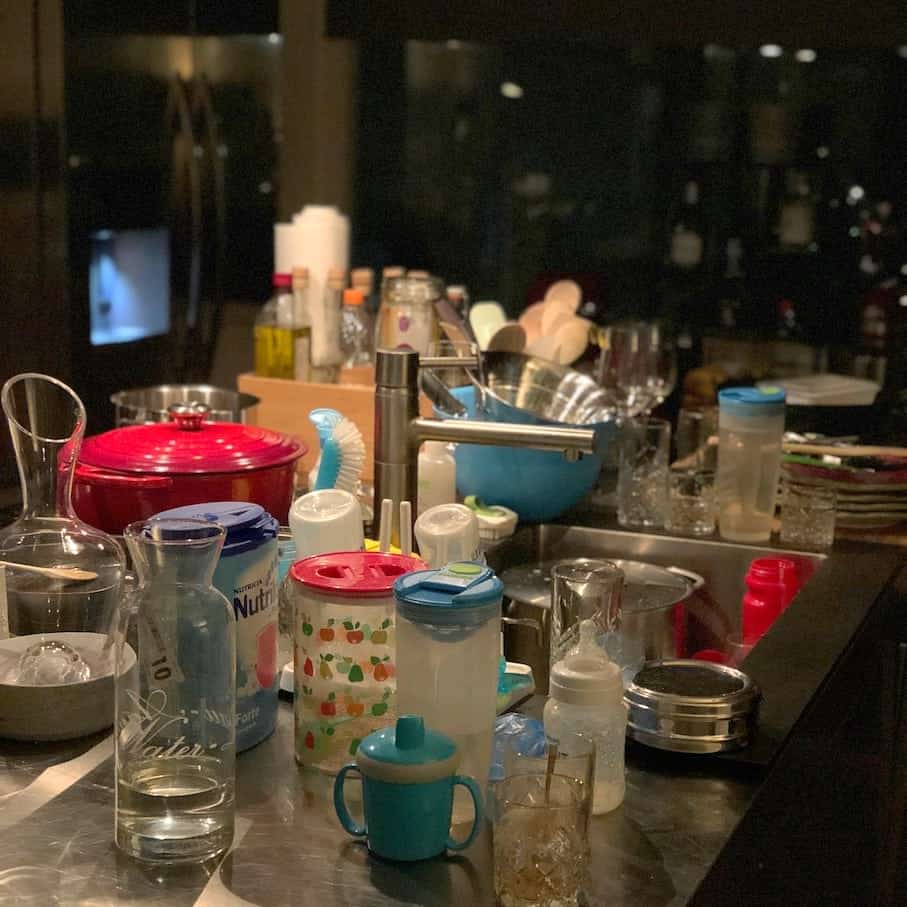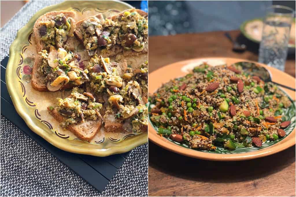 Het lukt me wonder boven wonder nog wel om lunch voor mezelf te maken en ik eet scrambled eggs met prei, paddenstoelen en pimenton op brood. In de avond eten we een quinoasalade met courgette, doperwten en amandelen. Was niet echt mijn ding, maar mijn mannen vonden het wel lekker. Hebben jullie trouwens ’s avonds ook altijd zo’n ontplofte keuken???