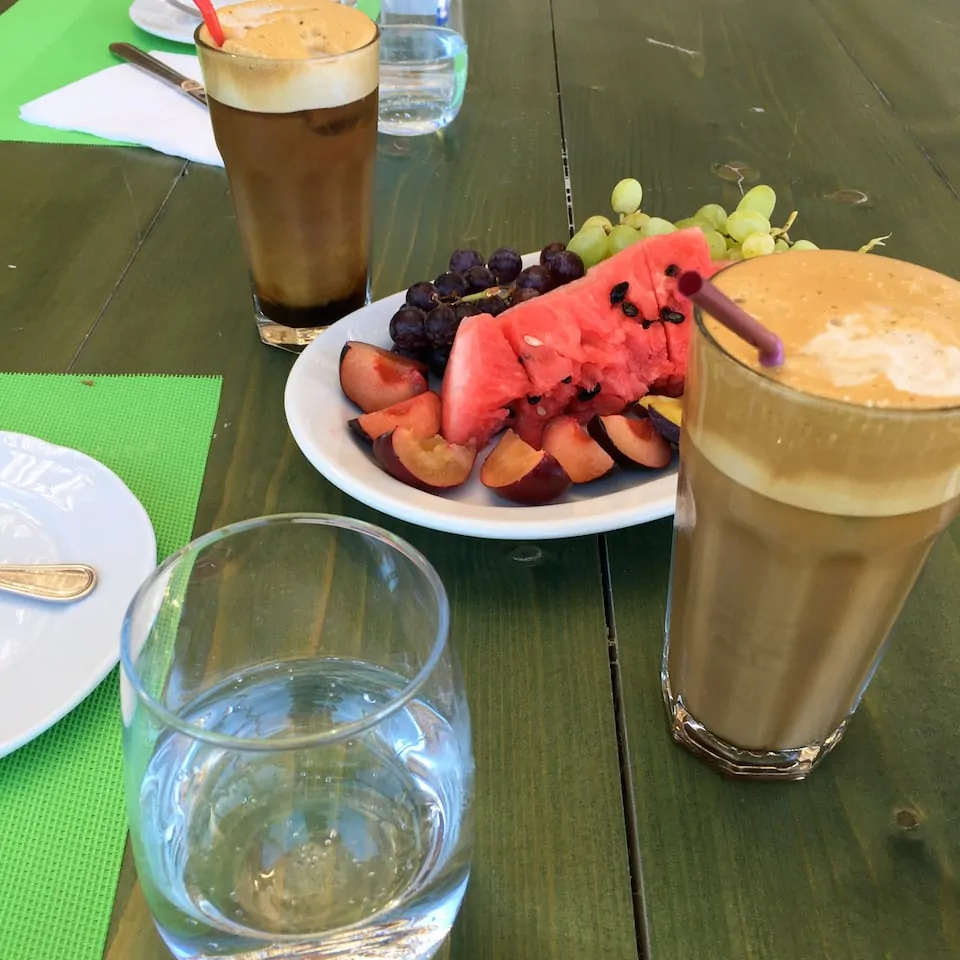 Er is ook de hele dag iemand aanwezig waar je iets te drinken of eten bij kunt bestellen. Vooral de frappe, oftewel ijskoffie, werd veelvuldig door ons besteld. Met ‘cream’ en ‘medium sweet’, zalig. Vooral ook omdat de Griekse gewone koffie mij nu even een tandje te sterk is.