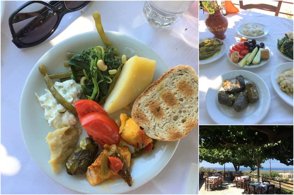 Over onze eerste accommodatie ga ik zwijgen, daar wil ik niemand van jullie naartoe sturen. En als ik erover begin dan hou ik nooit meer op en wordt dit zo’n vervelend artikel. In deze omgeving hebben we natuurlijk wel gegeten en lekker ook. Zoals gezegd was het onze eerste keer in Griekenland en ik wist niet wat ik kon verwachten. Mijn Griekse eetrepertoire bestond voorafgaand met name uit moussaka, tzatziki en souvlaki. Gerechten die je trouwens allemaal ook op Kreta moet bestellen, want dan weet je pas echt hoe het hoort te smaken. Ik ontdekte al snel dat de Kretenzers een van de meest gezonde levensstijlen van de wereld hebben. Door het veelvuldig gebruik van olijfolie, verse (veelal biologische) groenten en fruit, olijven en brood in hun dieet. Daarentegen eten ze minder vlees. Op het eiland vind je alleen meer olijfolie, niet zo gek als je de hoeveelheid olijfbomen ziet. En de kruiden, die mag ik echt niet vergeten. Overal groeien kruiden in het wild: oregano, salie, rozemarijn, tijm en dictamus bijvoorbeeld. Die gaan door het eten, maar daar maken ze ook zalige blends van voor in de thee. Over eten maak je hier geen grappen, daar neem je de tijd voor (ook ‘s middags) en het liefst met elkaar.
