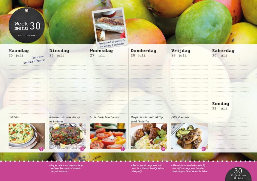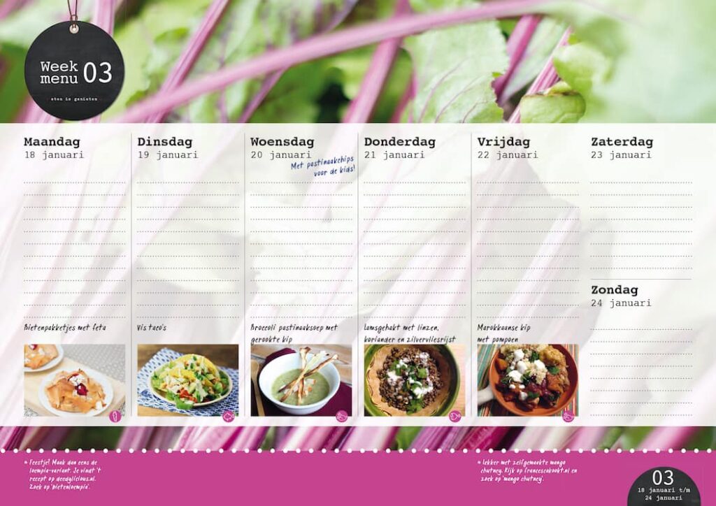 In de Eetkalender 2016 vind je 52 weekkalenders met voldoende ruimte om alle afspraken en verjaardagen op te schrijven voor de hele week. Iedere week hebben we een menu opgenomen met makkelijke recepten voor doordeweeks. We variëren daarbij met vegetarisch, vis, vlees en gevogelte en de gerechten zijn geschikt voor het hele gezin. Op de achterkant staan de recepten en vind je ook een boodschappenlijstje voor die week. In totaal staan er 260 recepten in de kalender. Nooit meer stress over het avondeten in 2016, hoe fijn is dat! We besteden ook aandacht aan seizoensproducten. Zo vind je iedere maand een overzicht van de groenten, fruit en andere producten van Hollandse bodem.