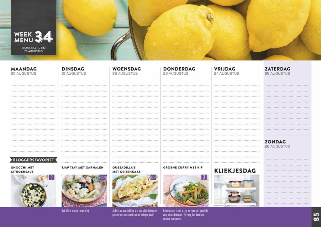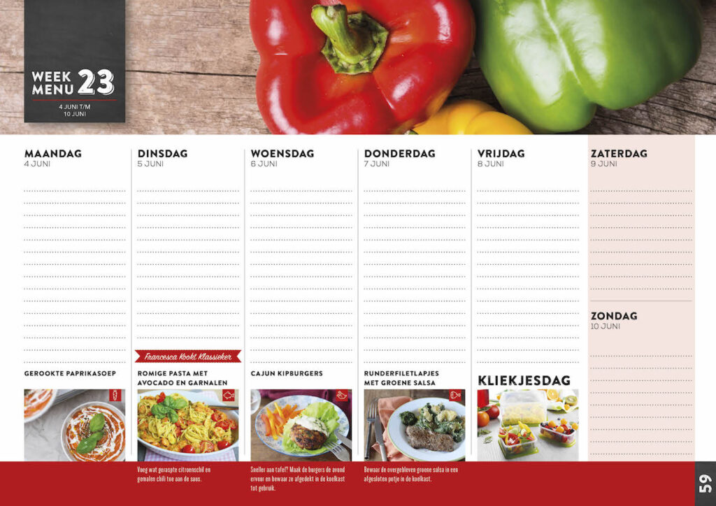 “De handige boodschappenlijstjes zorgen ervoor dat je in een keer de boodschappen kunt doen voor de hele week. Dat zou mij veel tijd en geld schelen, want ik ga nu bijna iedere dag naar de supermarkt. De handige weekplanners met genoeg ruimte om de activiteiten van alle gezinsleden op te schrijven maken dit de meest handige en lekkerste kalender van Nederland!” Lees verder