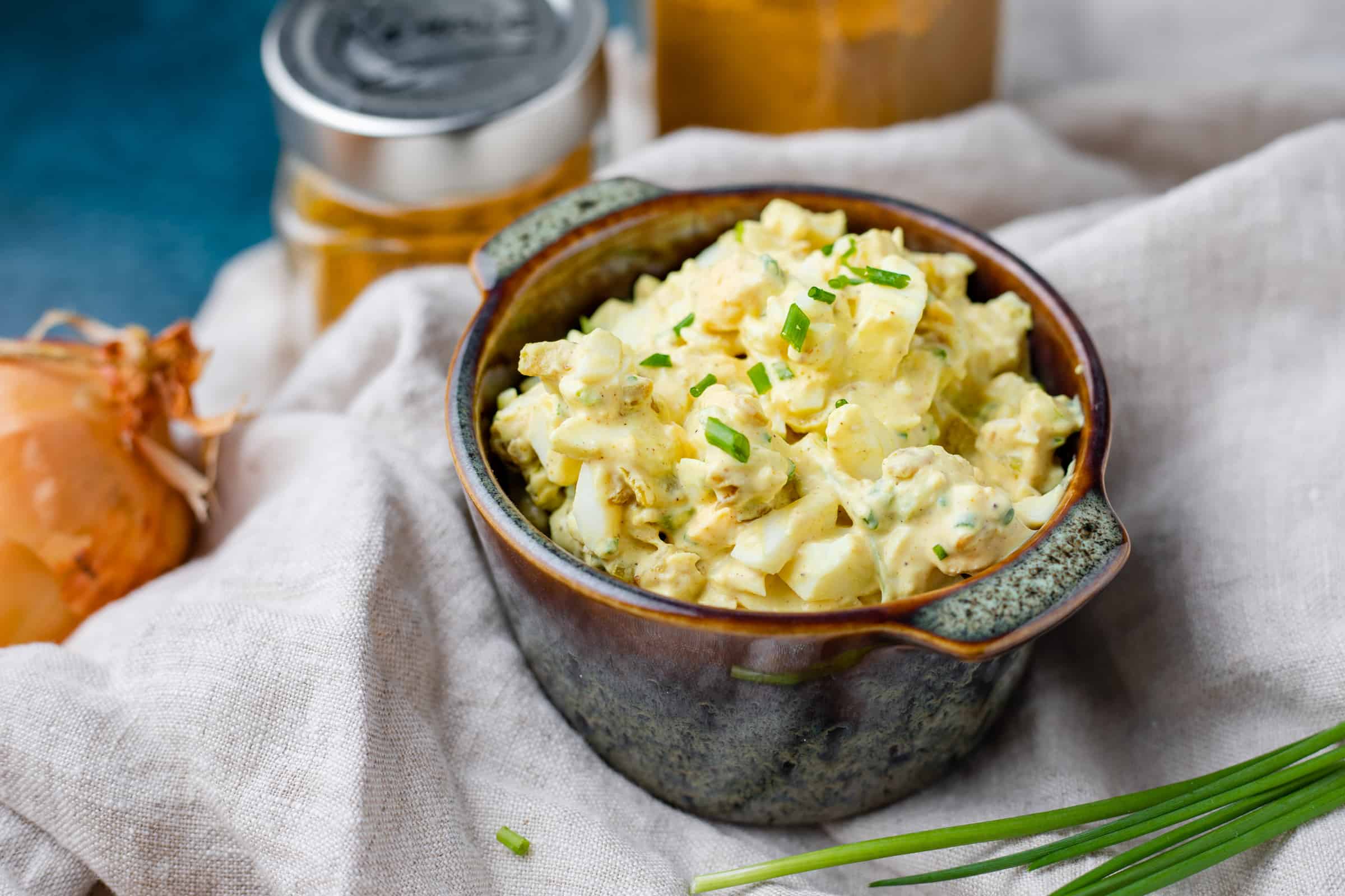 Ik hou er enorm van, van een lekkere eiersalade dus. Maar niet van kant-en-klare eiersalade uit een bakje, want die is vaak zo papperig. In mijn zelfgemaakte variant tref ik graag nog wat grove stukjes ei aan en hij mag goed op smaak zijn. Daarom voeg ik wat gebakken ui