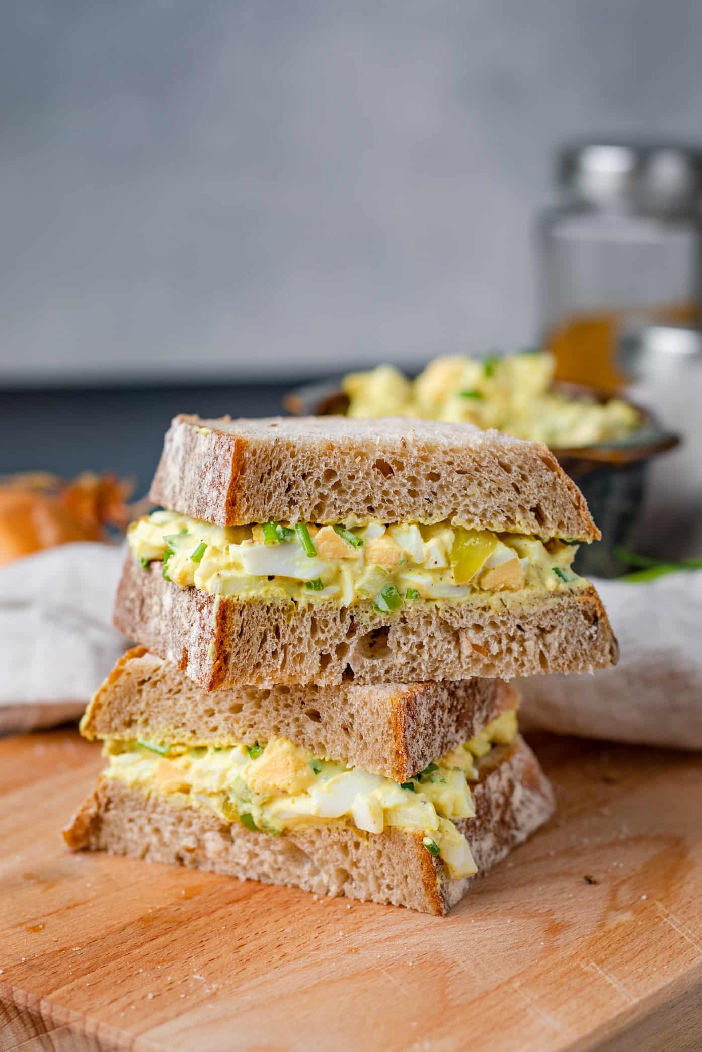 Ik hou er enorm van, van een lekkere eiersalade dus. Maar niet van kant-en-klare eiersalade uit een bakje, want die is vaak zo papperig. In mijn zelfgemaakte variant tref ik graag nog wat grove stukjes ei aan en hij mag goed op smaak zijn. Daarom voeg ik wat gebakken ui met kerrie toe, maar liever nog een combinatie van de normale, milde kerrie en de Surinaamse masala kerrie.