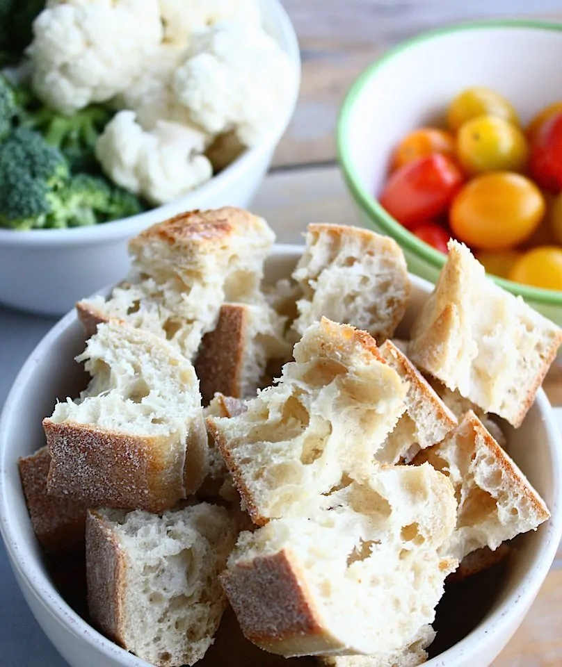 Natuurlijk serveer je er blokjes brood bij. Het lekkerste is als deze al een beetje oud zijn, want vers brood wordt snel papperig na het dopen in de kaas.