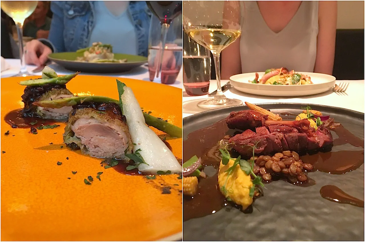 Dan natuurlijk het eten. Het voorgerecht van octopus, gebakken dorade en kruidenvinaigrette was meer dan een goede start. Blijkbaar heb ik in mijn leven nog nooit eerder op de juiste wijze octopus gegeten en heb ik nu eindelijk een goed referentiekader voor de toekomst. Want als ik het goed begrepen heb van Francesca hoort octopus niet als rubber, maar zo mals als bij DenC te smaken. Het tussengerecht was een een typisch wildgerecht met konijn, groene kool en gebrande aubergine. En als hoofdgerecht werd filet en bout van wilde eend geserveerd met jus van steranijs.
