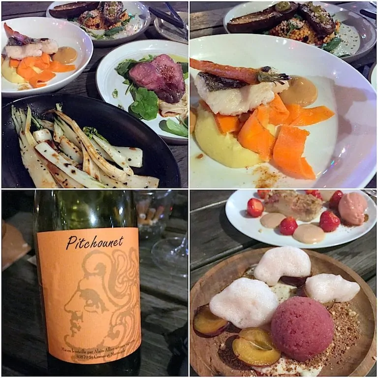 Voor het hoofdgerecht wordt onze tafel weer volgezet met bordjes. Zoals heek uit de houtoven met schuim van krab en kimchi van wortel, aubergine met tabouleh en pistache, bloemstuk van kalf en raapstelen en paksoi met soja. We drinken er een fles Pitchounet bij, licht rood en zeer bloemig/fruitig. Bijzonder smaakvol bij de gerechten.