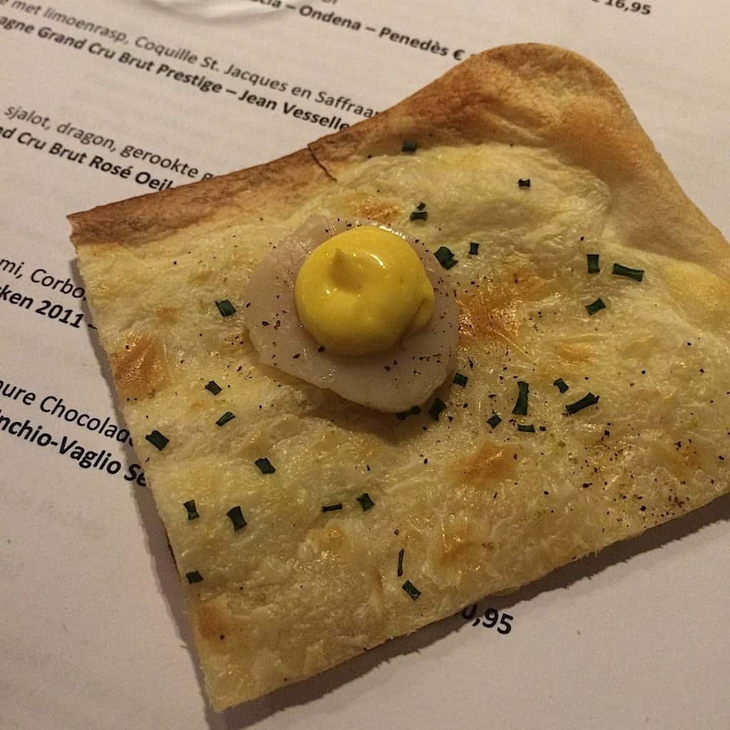 Crème met limoenrasp, coquille st. jacques en saffraancrème