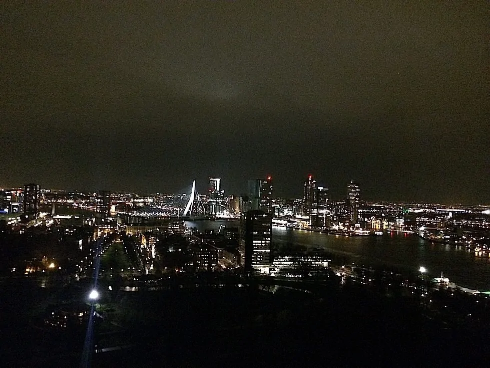 De keuze voor Deli als locatie was bijzonder goed gevonden. Al was het alleen maar omdat Deli al jaren tarte flambées (ander woord voor) op de kaart heeft staan. Sterker nog, Deli was een van de eerste flammkuchen cafés in Nederland. Fijne ambiance, mooi ingericht en goede bediening. Ik was er enthousiast over. En dan die locatie, want je bent maar 1 lift verwijderd van de top van de Euromast. En natuurlijk zijn we daar ook geweest. Al was het in mijn geval niet langer dan het duurde om deze foto te maken, want het was ietwat winderig. Ik heb inmiddels wel het goede voornemen om in 2014 boven in de brasserie te eten, want het uitzicht is adembenemend.