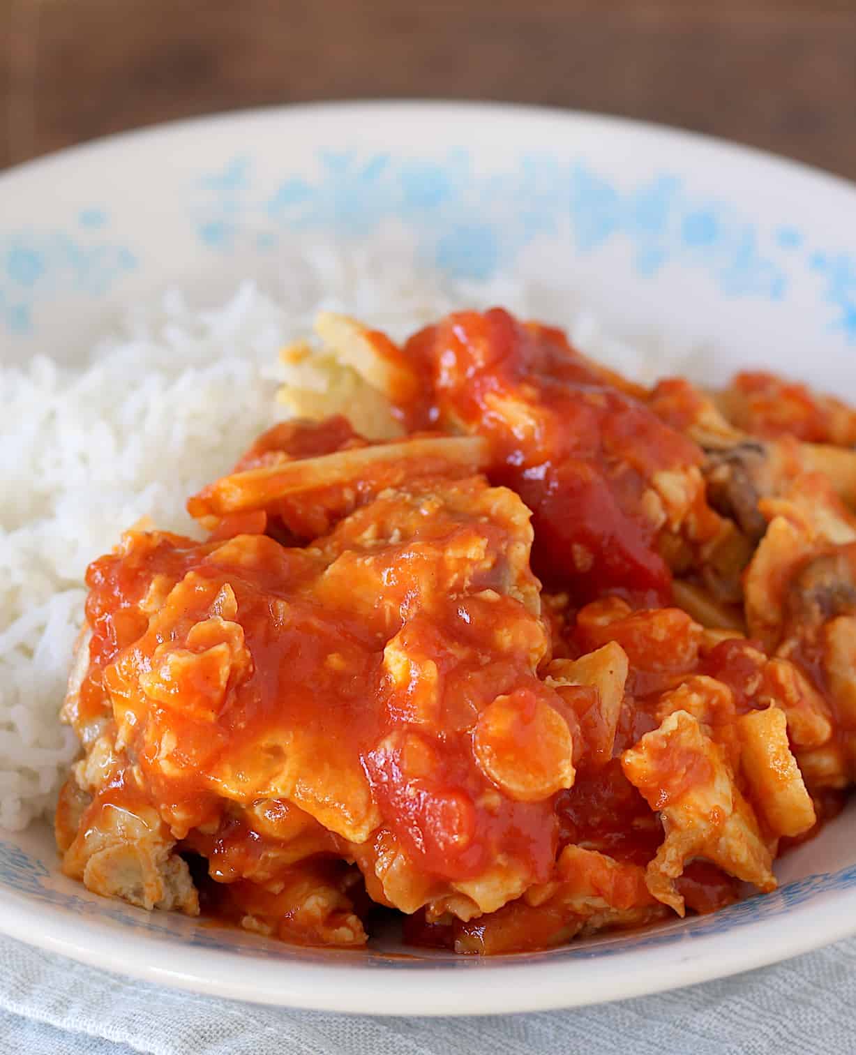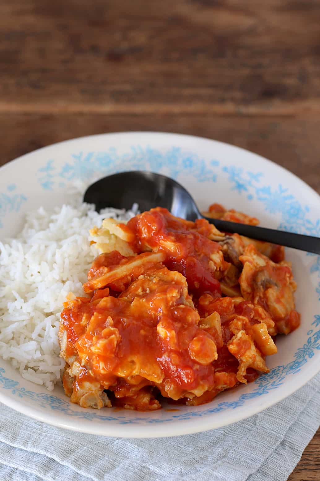 - Schenk de tomatensaus over de omelet, warm door en serveer met witte rijst.