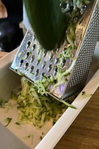 - Rasp de komkommer grof met een handrasp. Vang de geraspte komkommer in een zeef en strooi er wat zout over. Laat ongeveer een kwartiertje uitlekken en knijp daarna het vocht er goed uit met je handen. Je kunt het ook in een kaasdoek scheppen en daarna goed uitknijpen.
