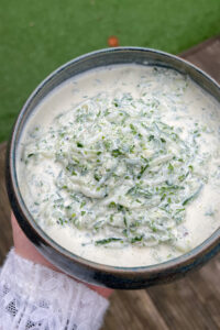 - Hak de knoflook, blaadjes peterselie en blaadjes dille helemaal fijn en meng dit met de komkommerrasp in een kommetje. Roer de crème fraîche erdoor met 1 eetlepel mayonaise. Proef en bepaal of er nog extra mayonaise door moet. Voeg eventueel nog een snufje zwarte peper toe.