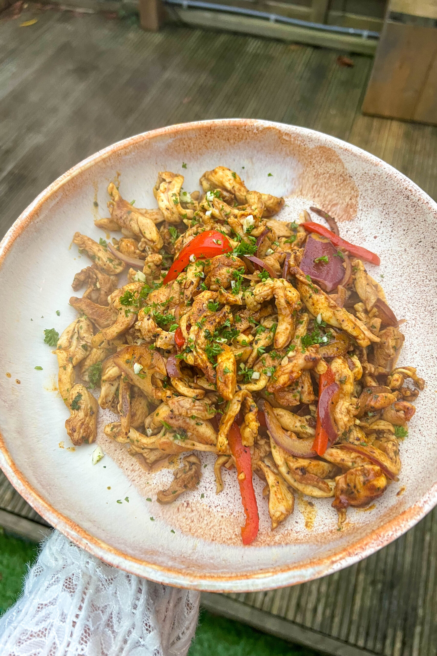 - Bak een deel van de kip in de pan aan en strooi er wat van de specerijenmix over (1 – 2 el afhankelijk van de hoeveelheid die de pan in gaat) en een goede snuf zout.