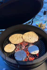- De pitabroodjes warm je op het rooster van de barbecue. Heel kort, om en om, want anders verbranden ze zelf. Dit kun je ook doen met het platbrood, dat moet nog korter.