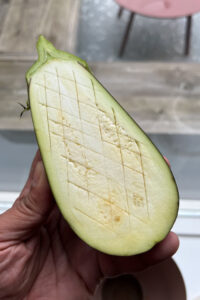 - Snijd de aubergines in de lengte doormidden. En snijd daarna in de snijkant ‘ruitjes’ met een scherp mes. Zo komt de olie met knoflook ook goed in de kern. Strooi er een beetje zout over en smeer ze daarna in met wat olijfolie en knoflook