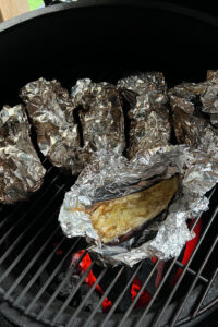 - Pak de aubergines per helft in aluminiumfolie. Leg ze op de barbecue voor 30 – 45 minuten en controleer vanaf 30 minuten even of ze al gaar zijn. Pas als het vruchtvlees door en door zacht is, mogen ze eraf.