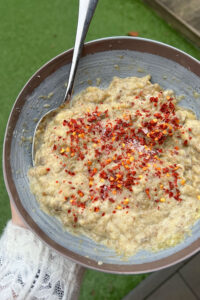 Naast shawarma eten ze ook graag aubergine en als je die eerst in z’n geheel roostert op de barbecue is dat een heerlijke basis voor een aubergine dip. En met ingrediënten zoals granaatappel, komkommer, paprika en verse kruiden kregen we nog veel meer inspiratie voor de bijgerechten van onze shawarma. En we maakten ook nog onze eigen ‘7-Spice’ specerijenmix. Die stiekem wat meer spices bevat, maar dat terzijde ;-).