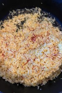 - Blender een hele ui en voeg toe aan het water samen met het komijnzaad, zout en de saffraan. Zet de rijstkoker aan houdt dit in de gaten, de rijst is klaar als het niet meer plakkerig is. Je wilt het liefst hele korrels rijst die los van elkaar en mooi droog en luchtig zijn gekookt.