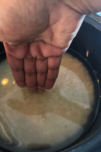 - Was hiervoor de basmatirijst eerst goed zodat de zetmelen afgespoeld worden. Dit kan je het beste doen met een zeef. Doe daarna de rijst in een rijstkoker of pan en voeg daar water aan toe tot je eerste vingertop. Ik gebruik zelf een rijstkoker.