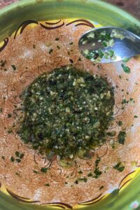- Schenk een scheut olijfolie in een kom en voeg de fijngehakte ingrediënten toe. Voeg hier nog het zeezout, de nootmuskaat en gemalen korianderzaad aan toe. Zorg ervoor dat de marinade een mooi papje wordt zodat zoals hieronder. Als het geheel te droog is, voeg je er nog wat olijfolie aan toe.