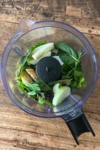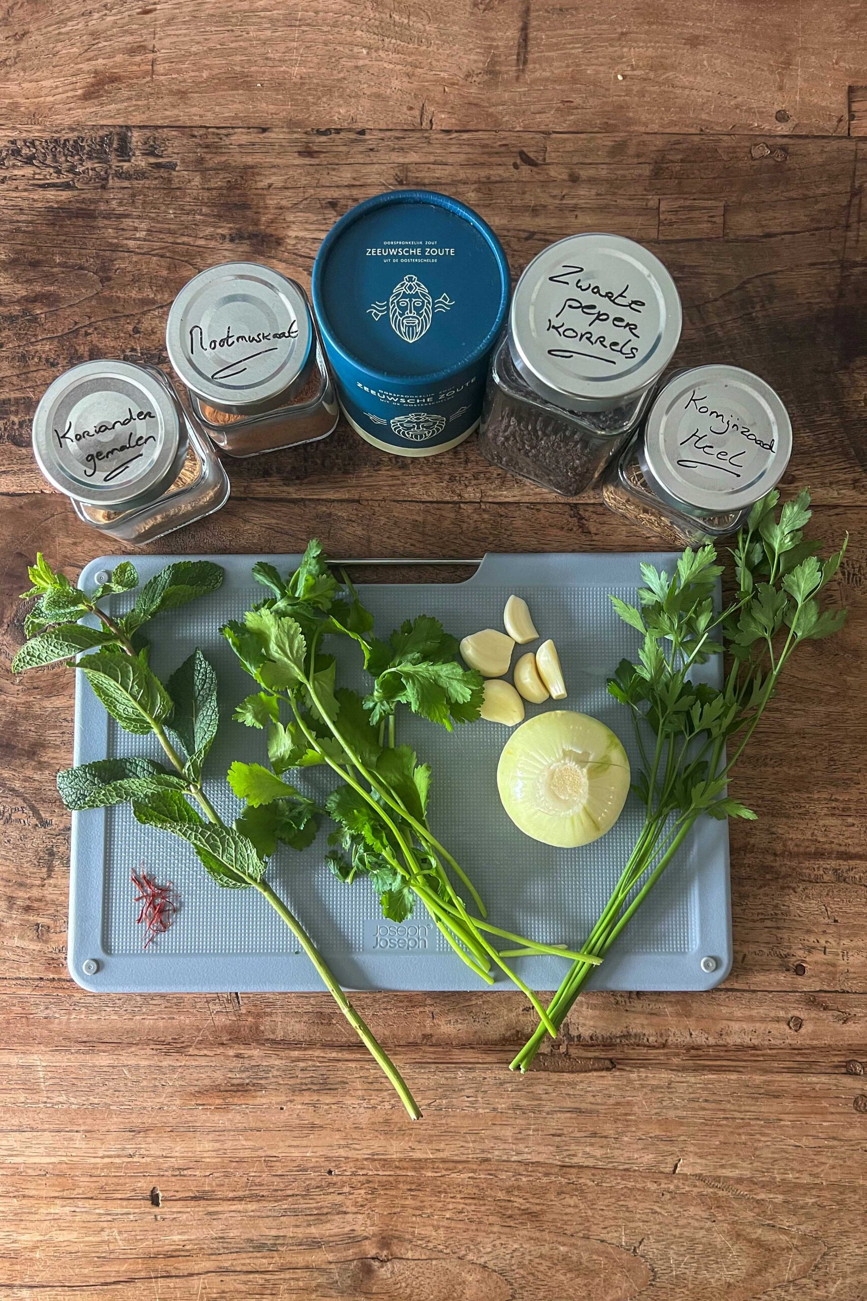 - Voor deze stap hebben we een hakmolen of keukenmachine nodig. Vul de hakmolen met de ui, teentjes knoflook, munt, peterselie, verse koriander, saffraan, zwarte peperkorrels en komijnzaad. Blender het geheel dan ongeveer 10 seconden. Het hoeft niet heel fijn te worden.