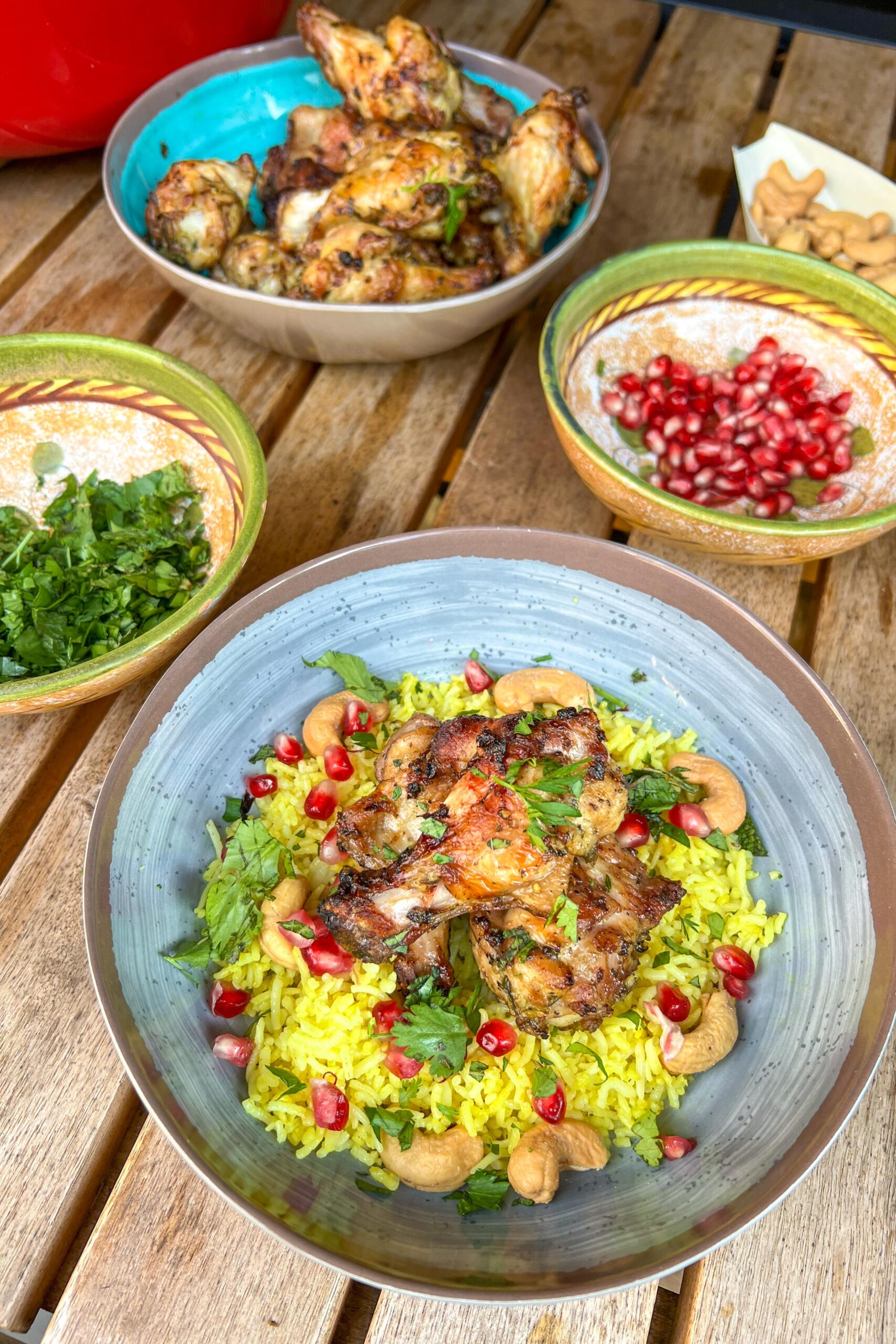 - Nu je alle gerechten en ingrediënten klaar heb kunnen we mooie bordjes met eten gaan serveren. Schep een beetje rijst op in een bordje, leg 2 of 3 stukjes kip daarbovenop, strooi wat granaatappel, gezouten cashewnoten en verse kruiden erover en klaar!