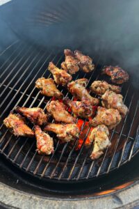 - Als we zover zijn gaan we verder naar de barbecue. We willen de kip eerst indirect garen en daarna nog even afgrillen op direct vuur. Steek de barbecue aan en verhit deze tot een temperatuur van 160 graden. Plaats de kippetjes op het indirecte gedeelte van de barbecue en laat deze garen, dit duurt 30 – 45 minuten. Draai de kippetjes om de 15 minuten even om. Prik af en toe met een kerntemperatuurmeter in een kipstukje om de temperatuur te meten. Als ze een kerntemperatuur hebben van 68 graden verplaats je ze naar de directe hitte boven de kolen om af te grillen. Ze krijgen ze een lekker krokant korstje en garen ze verder naar een kerntemperatuur van 72 graden. Let op dat ze niet te zwart grillen, dat zou zonde zijn.