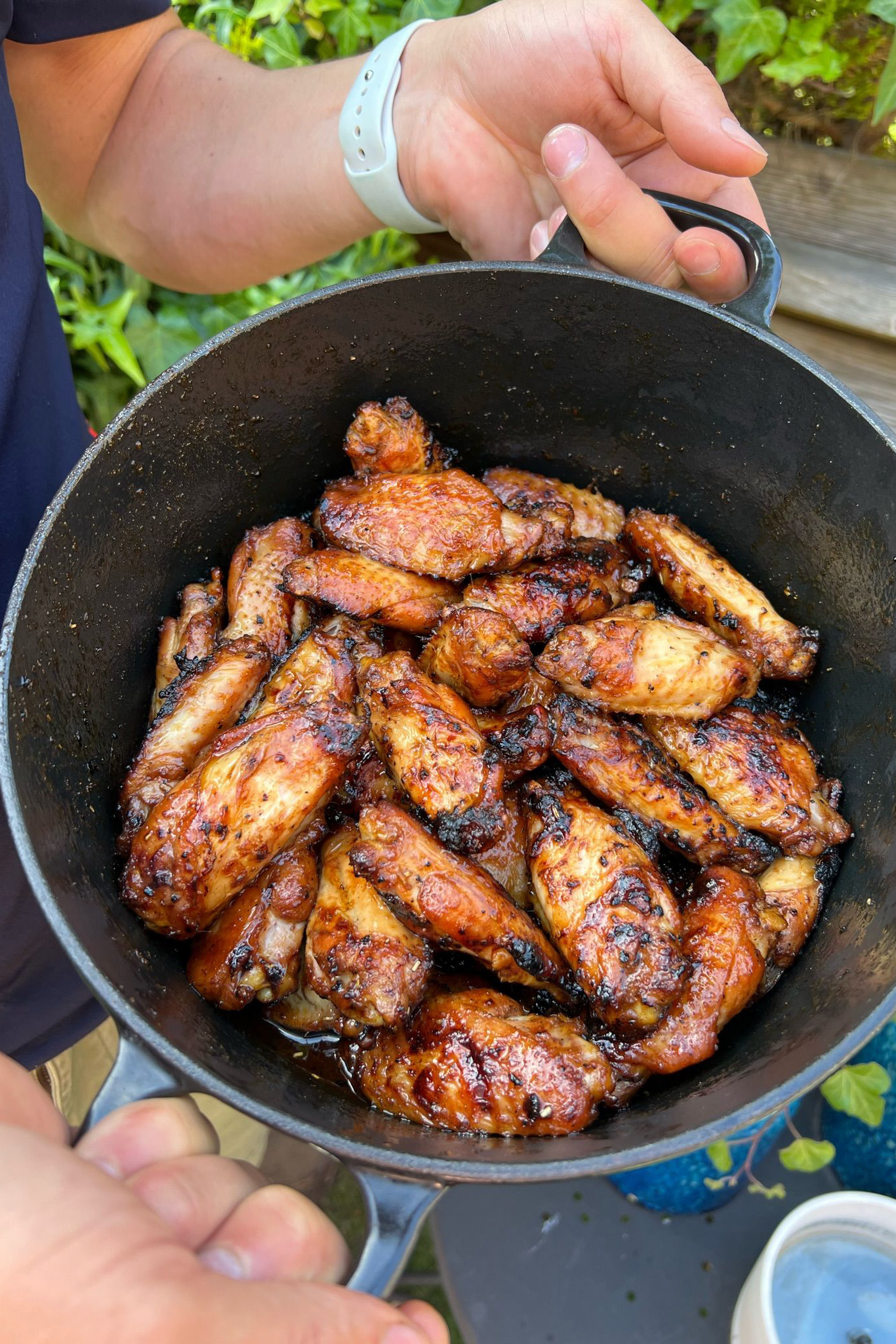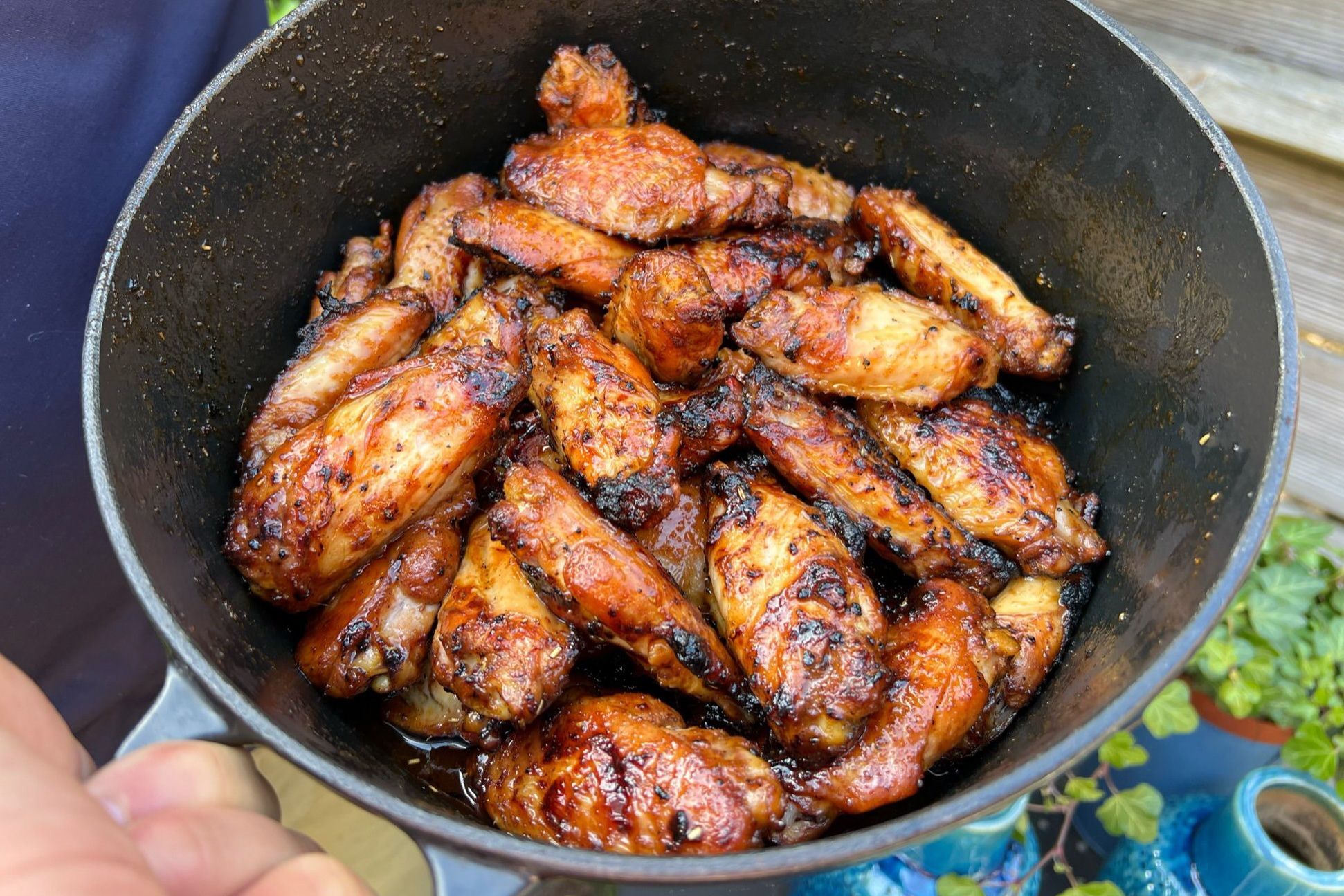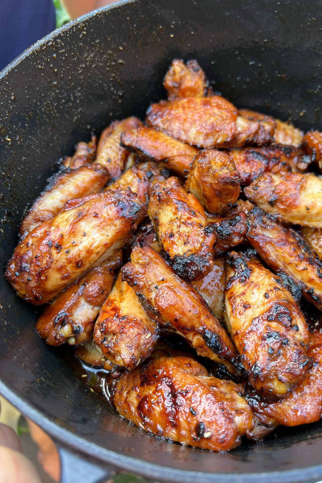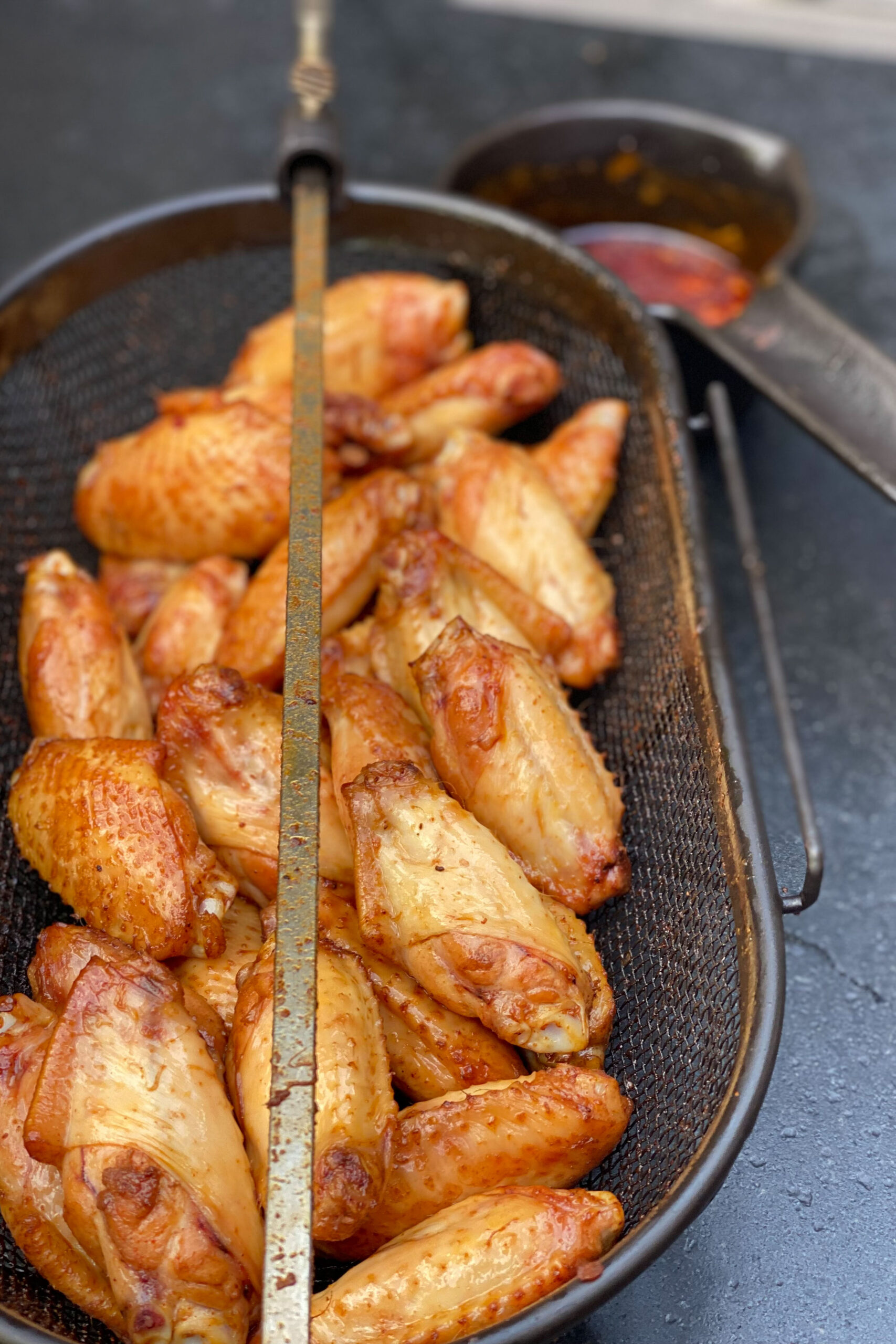 - Nu gaan we ze nog even een krokantje geven! Haal de kip weer even van de BBQ (hoeft niet afgedekt) en stook de BBQ op naar 180 – 200 graden. Leg de kip vervolgens op het directe deel van de BBQ (boven de kolen dus) en grill ze een paar minuten per kant. De saus zal misschien wat zwart worden (dat is de suiker die verbrandt) en dat is een beetje niet erg, maar hou het wel in de gaten! Je mag de wings in deze fase ook nog wat inkwasten met het restant van de saus als je lekker bezig wilt blijven, aangezien je ze toch goed in de gaten houdt.