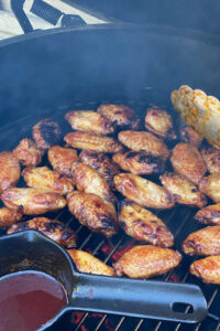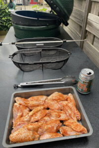 - Als je de juiste temperatuur hebt bereikt doe je een blokje (chunk) rookhout in het vuur, en laat je de wings 20 minuten op het indirecte deel lekker garen.