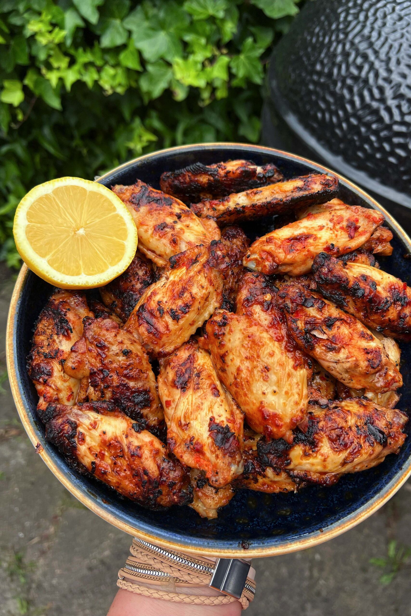 - Haal de kip uit de marinade en dep de vleugels een beetje droog zodat ze niet meer ‘te nat’ zijn. Er mag zeker nog wel marinade op de kip blijven zitten, maar niet te veel, want dat verbrand straks op de barbecue.