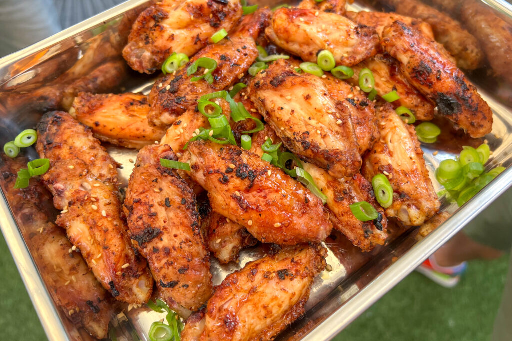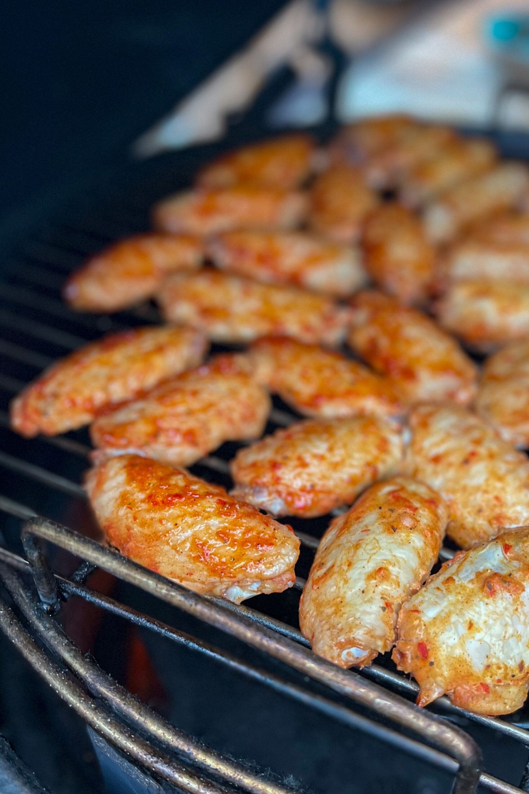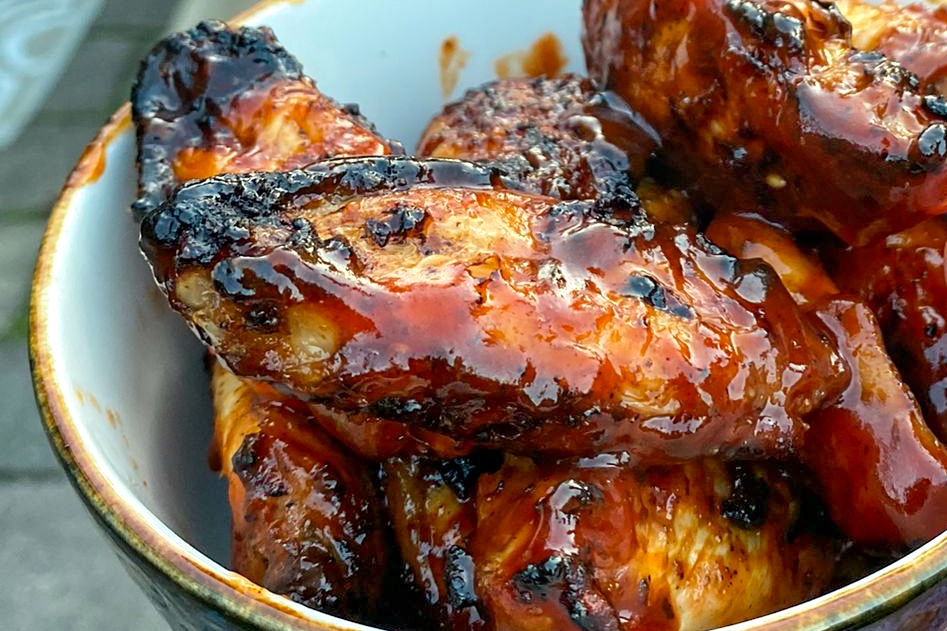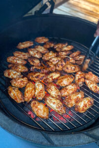 - Leg de kippenvleugels op het rooster, indirect boven het vuur. Draai ze een keer om en laat ze garen tot circa 68 graden. Duurt meestal 25 – 30 minuten.