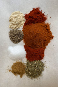 - Pak een grote kom of een ziplockzak (waar straks ook alle kip in past) en giet het paprikamengsel dat je net gemaakt hebt erin. Voeg daaraan alle kruiden van de ingrediëntenlijst toe, halveer de citroen en knijp 1 helft uit boven de marinade en roer alles goed door.